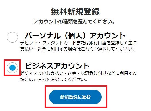 3. 「ビジネスアカウント」を選択して「新規登録に進む」をクリック