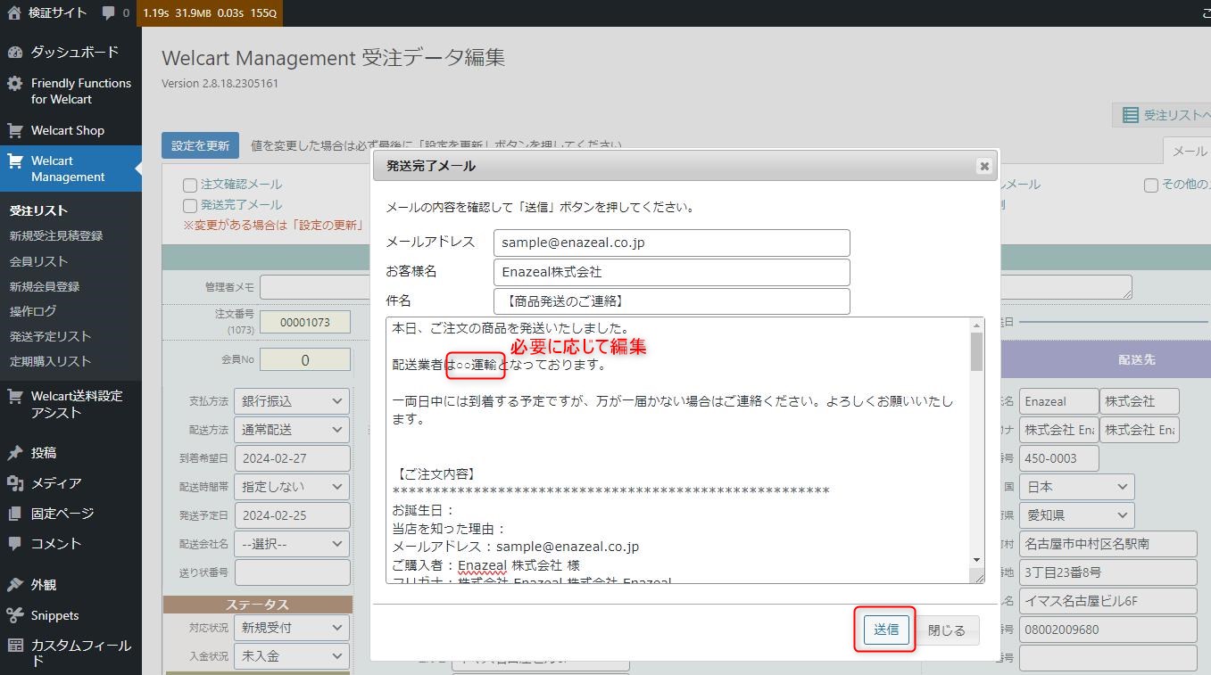 4. メールの送信画面が開くので、内容を確認・必要に応じて編集し、[送信]をクリック