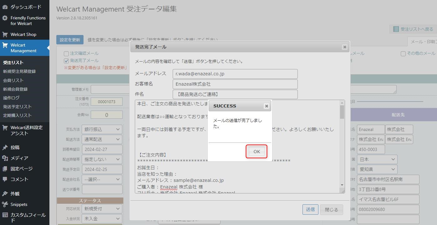 5. 「メールの送信が完了しました」と表示されるので、[OK]をクリック