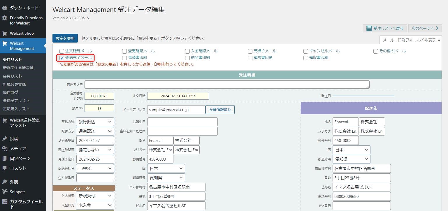 左メニューより[Welcart Management] > [受注リスト]をクリックし、